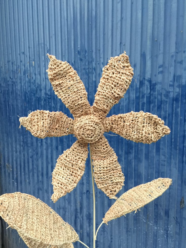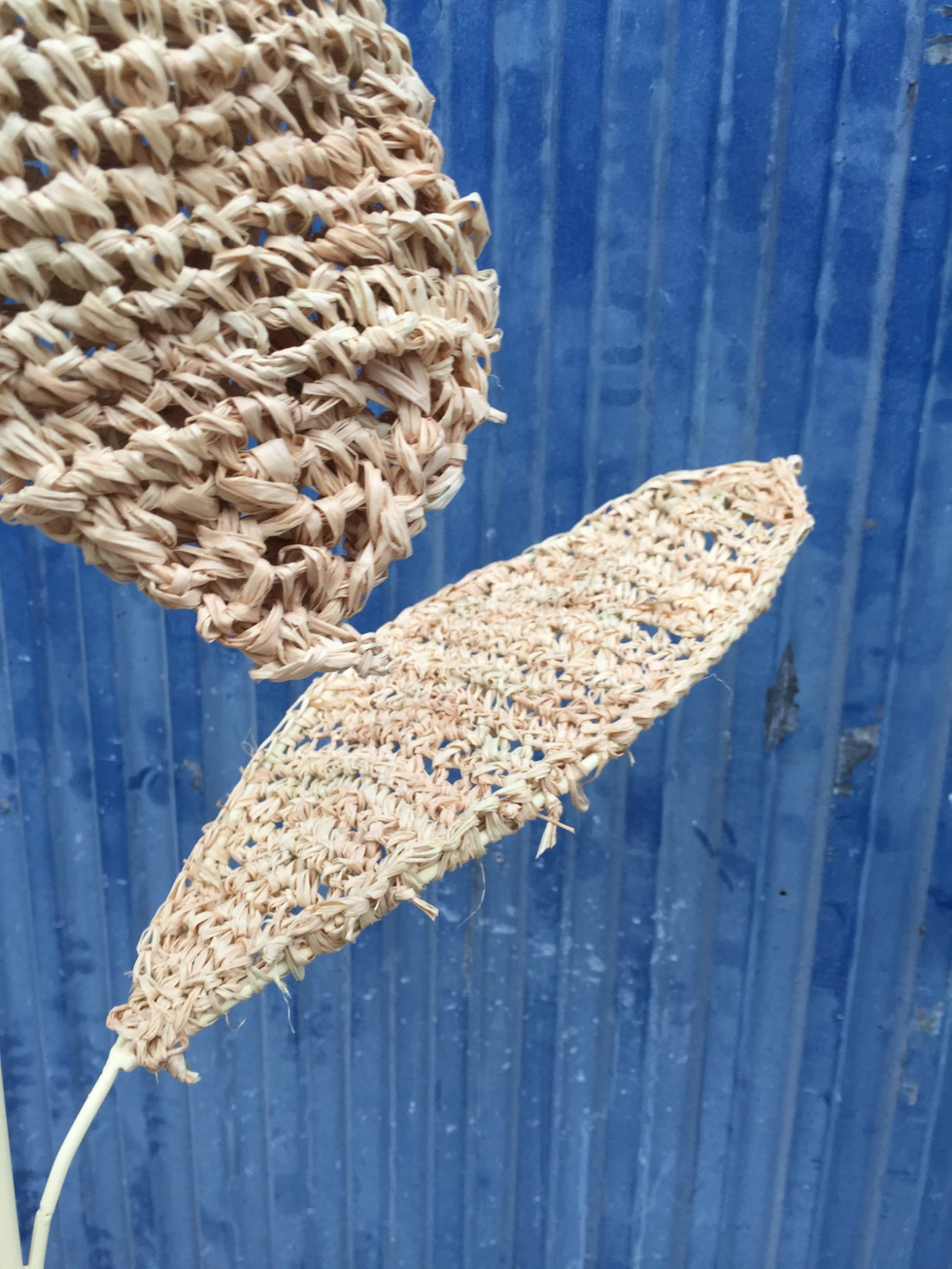 Flores feitas em crochet com ráfia. Adaptadas a uma estrutura de metal executada por Rodrigo Meireles.
