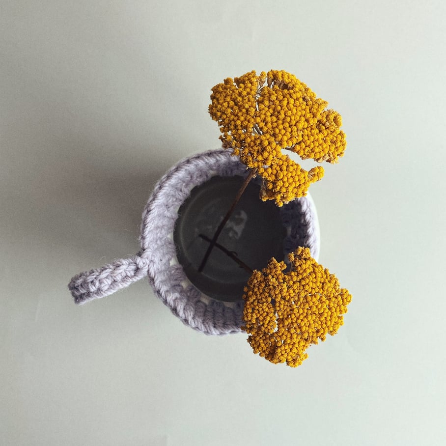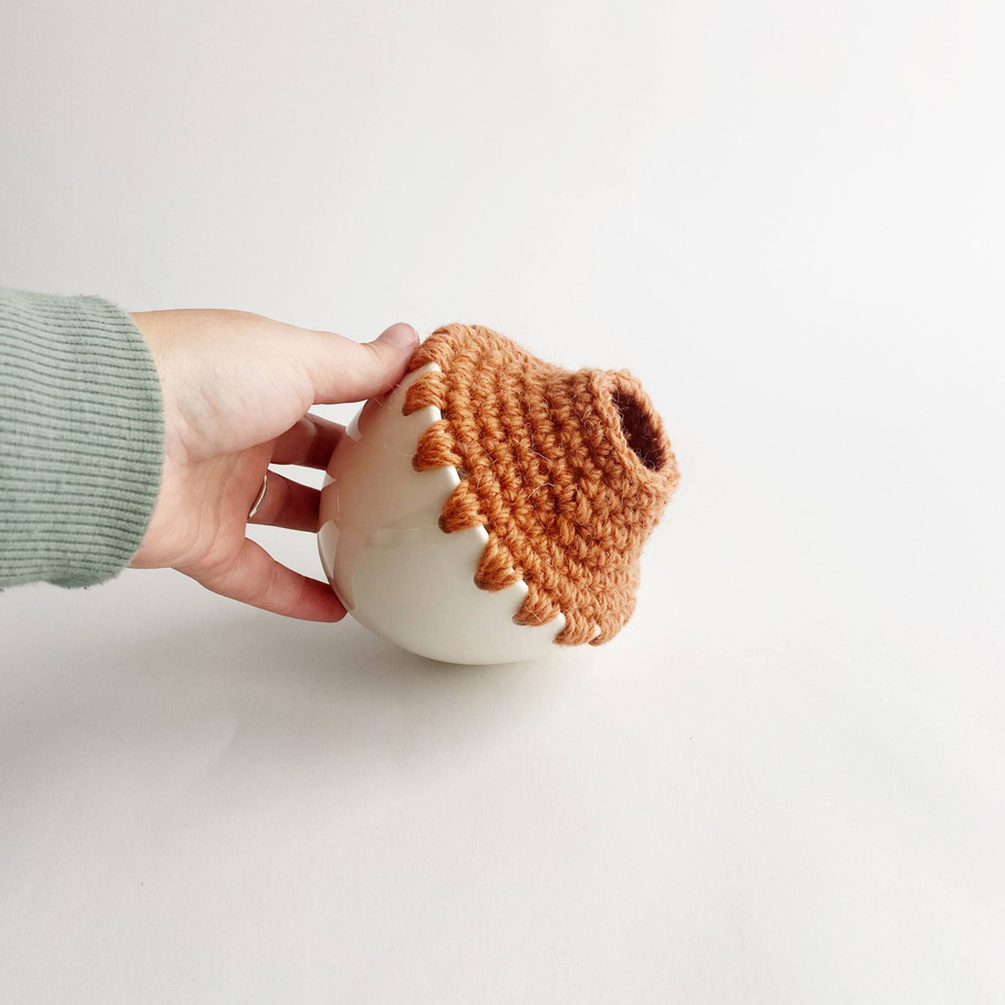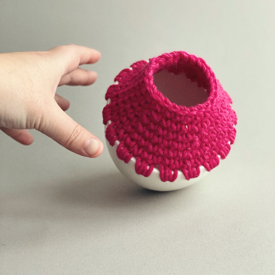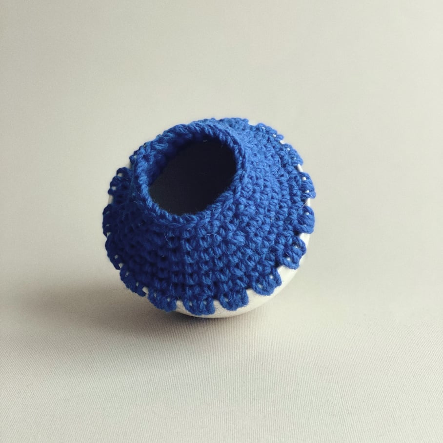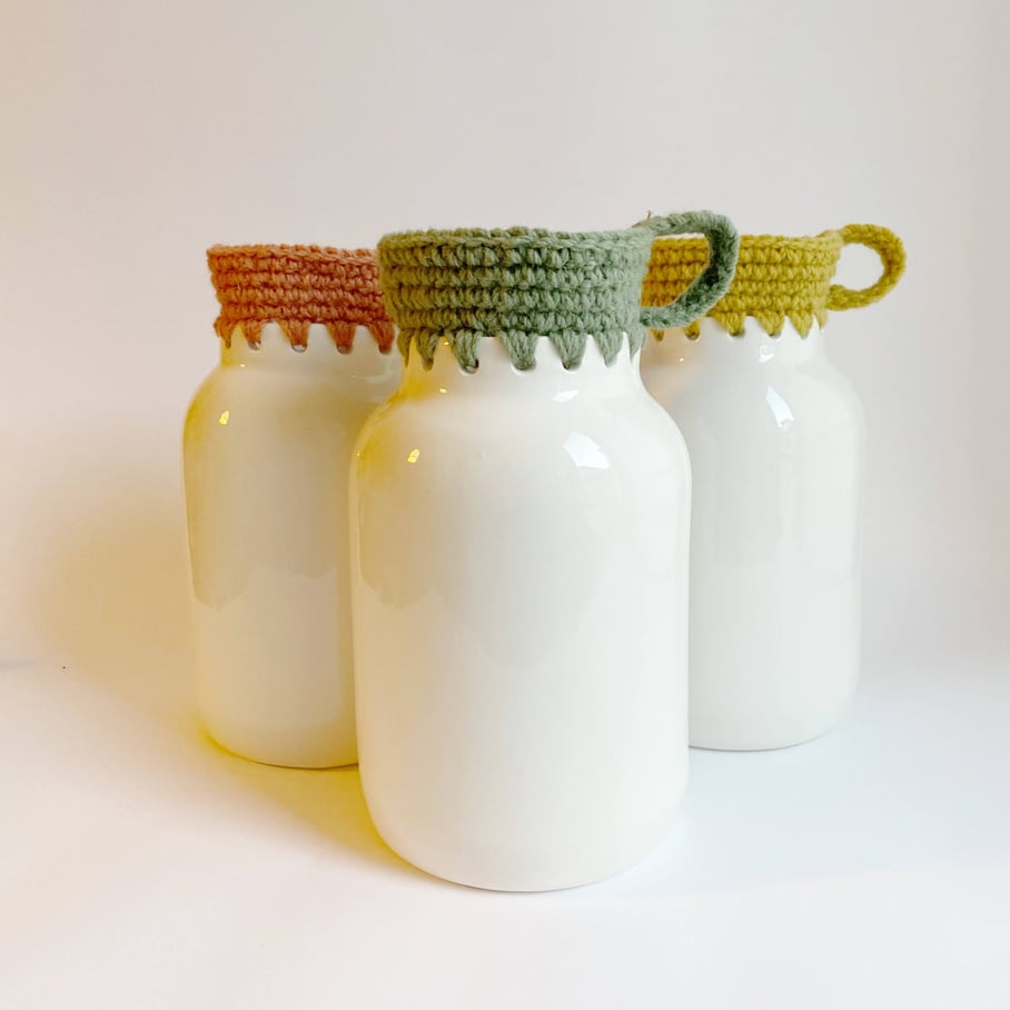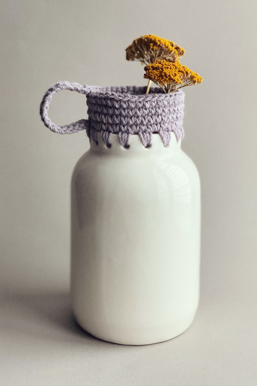 Jarra de cerâmica com detalhe em crochet feito com lã de arraiolos.