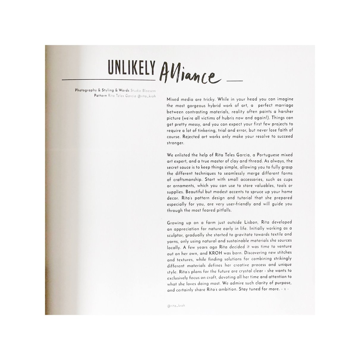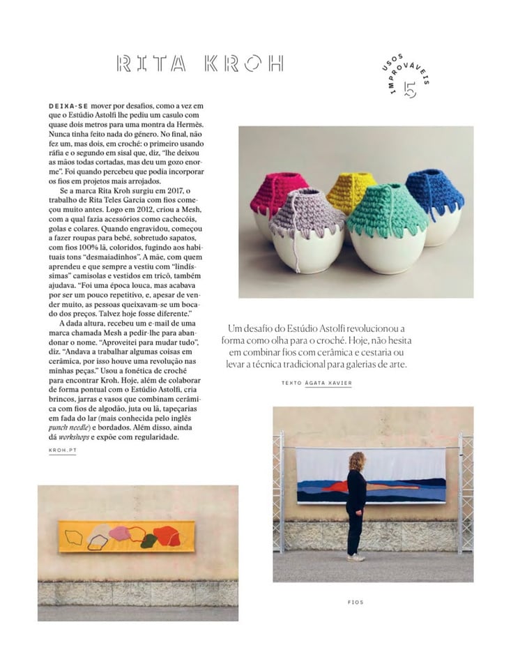 Em paralelo, criou o seu primeiro projeto pessoal em 2012, explorando o crochet como técnica base em diversos acessórios, mas em 2017 vira a página e inicia um novo ciclo com a atual KROH.