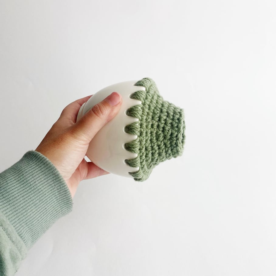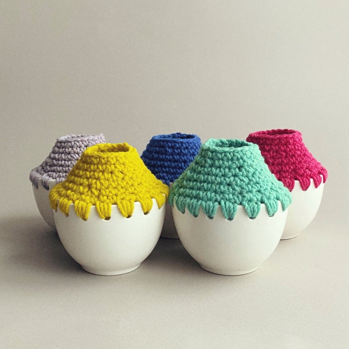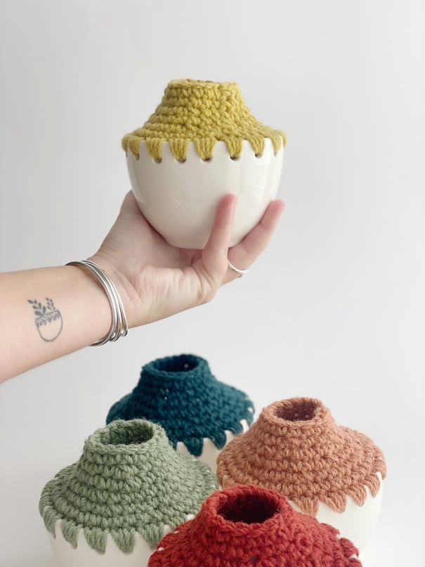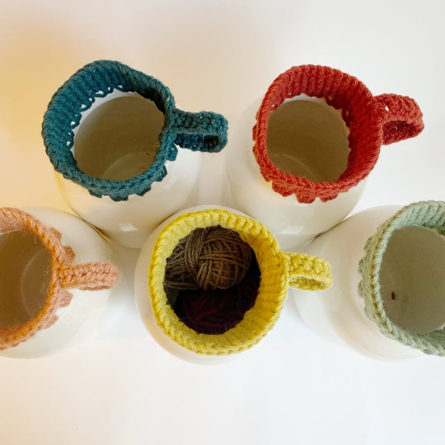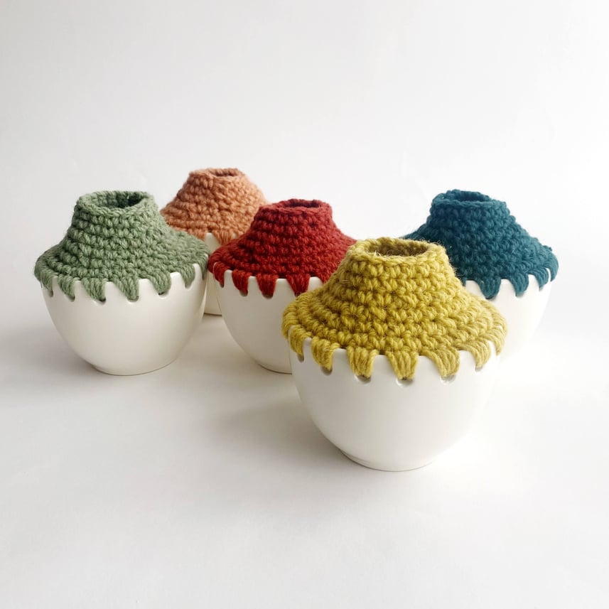 Taças de cerâmica com detalhe em crochet feito com lã de arraiolos.
