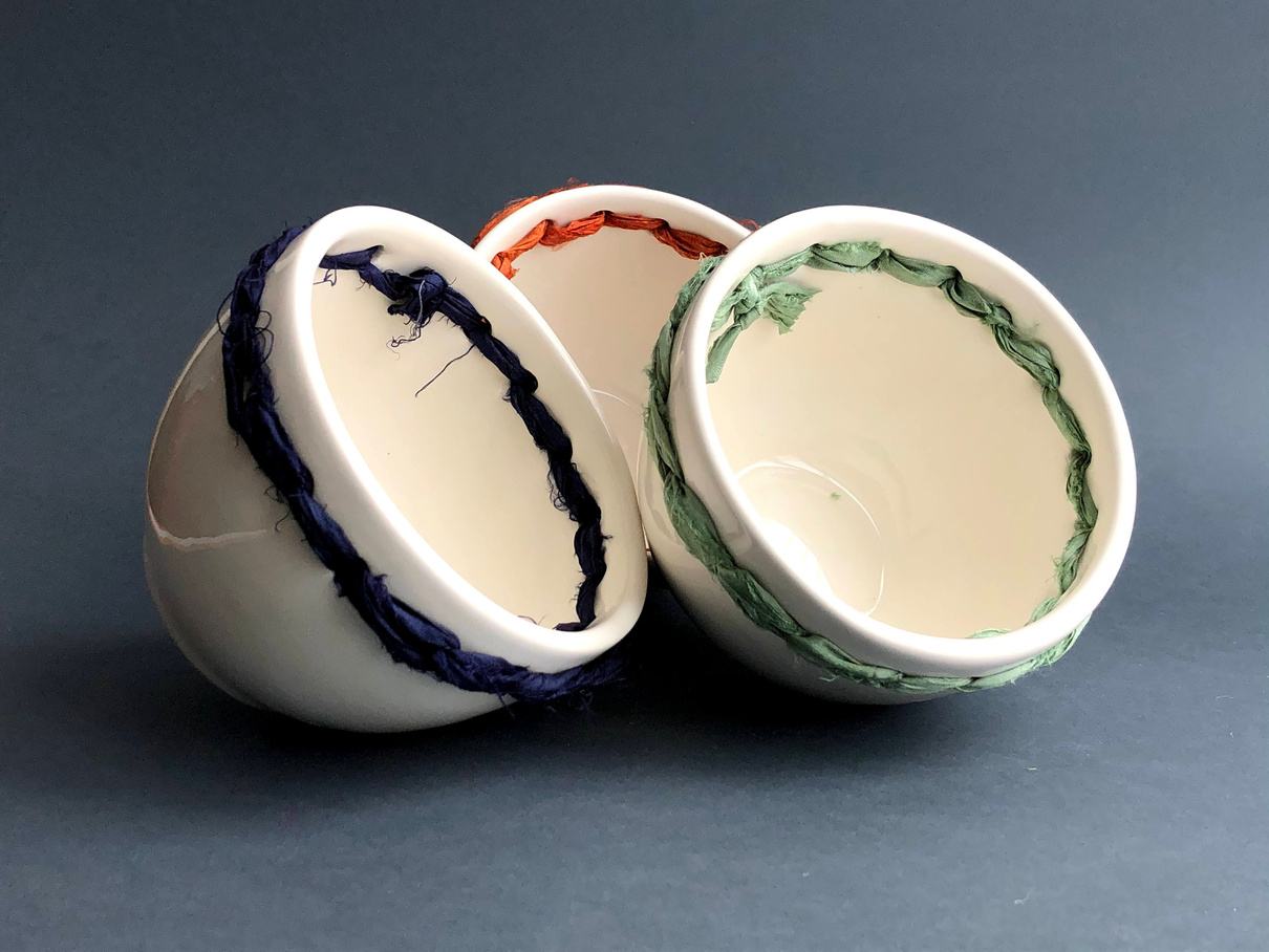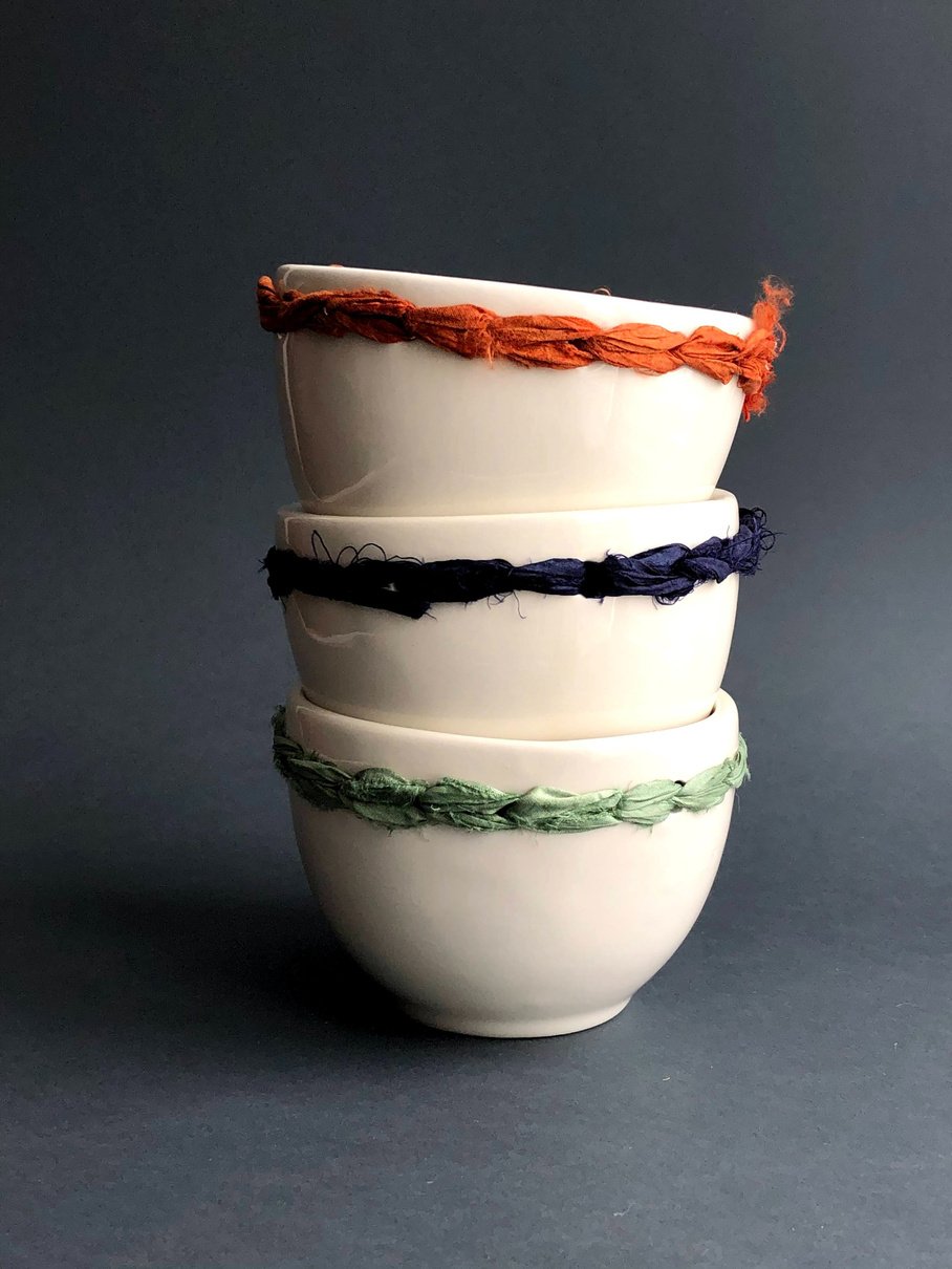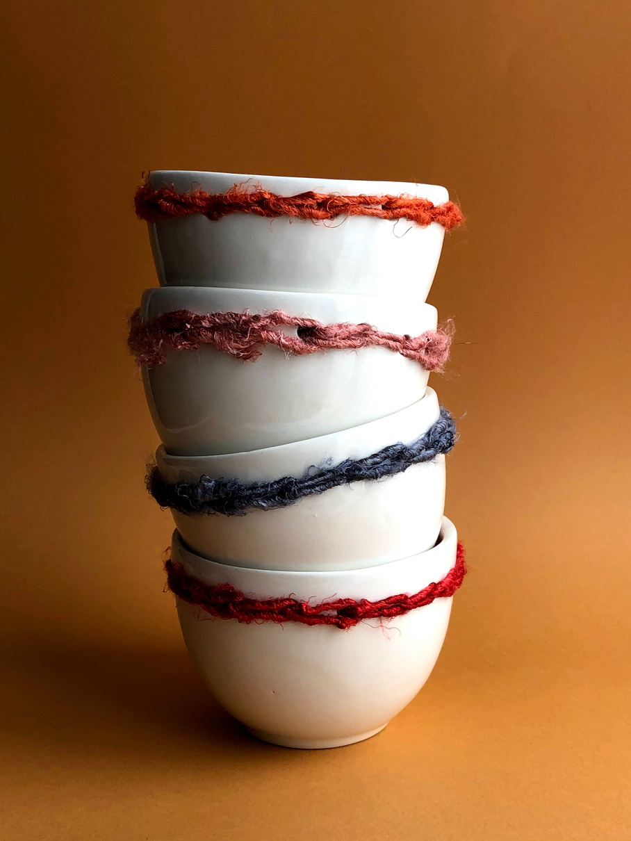 Taças de cerâmica com detalhe em crochet feito com desperdício de seda dos saris indianos.