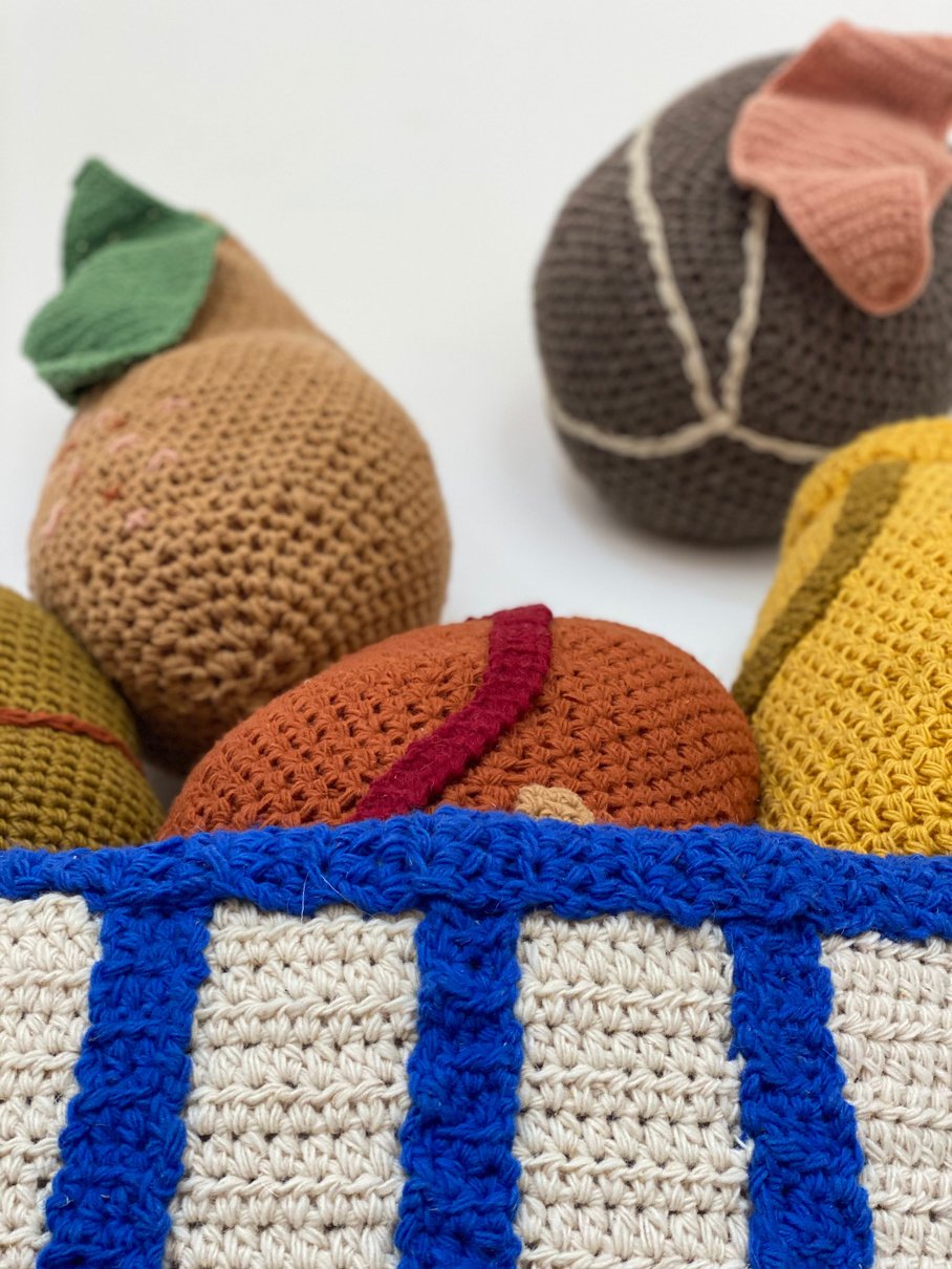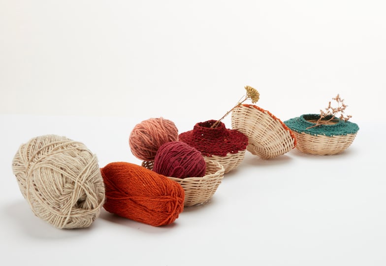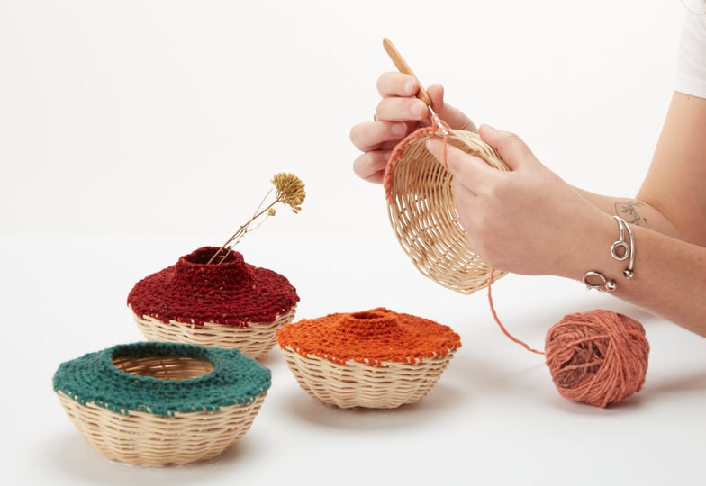 cestas de vime com detalhe em crochet feito com lã portuguesa.